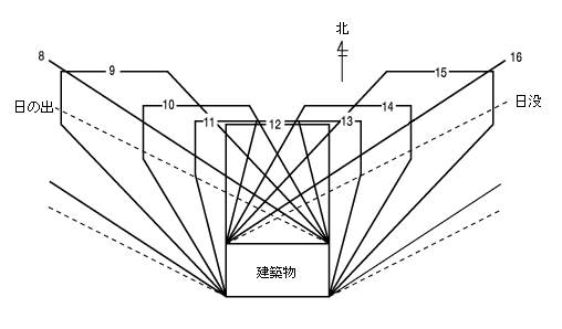 図は、ある地点の水平面上に建つ建築物(直方体)の、冬至日における1時間ごとの日影図(数字は真太陽時を示す)である。建築物の高さが2倍になると、4時間日影線は変化する。