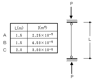 図のような長さL(m)の柱(材端条件は、両端ピン、水平移動拘束とする。)に圧縮力Pが作用したとき、A、B、CのLとIの組合せのうち、弾性座屈荷重が最も大きくなるものは、Bである。ただし、Iは断面二次モーメントの最小値とし、それぞれの柱は同一の材料で、断面は一様とする。