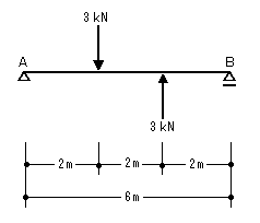 下図のような荷重を受ける単純ばりの支点Bにおける反力の値は、−1kN となる。ただし、反力の方向は、上向を「+」、下向きを「−」とする。