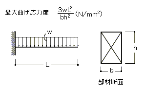 図のような等分布荷重w(N/mm)を受ける長さL(mm)の片持ばりに断面b(mm)×h(mm)の部材を用いたとき、その部材に生じる最大曲げ応力度は、次式で表すことができる。ただし、部材の自重は無視するものとする。